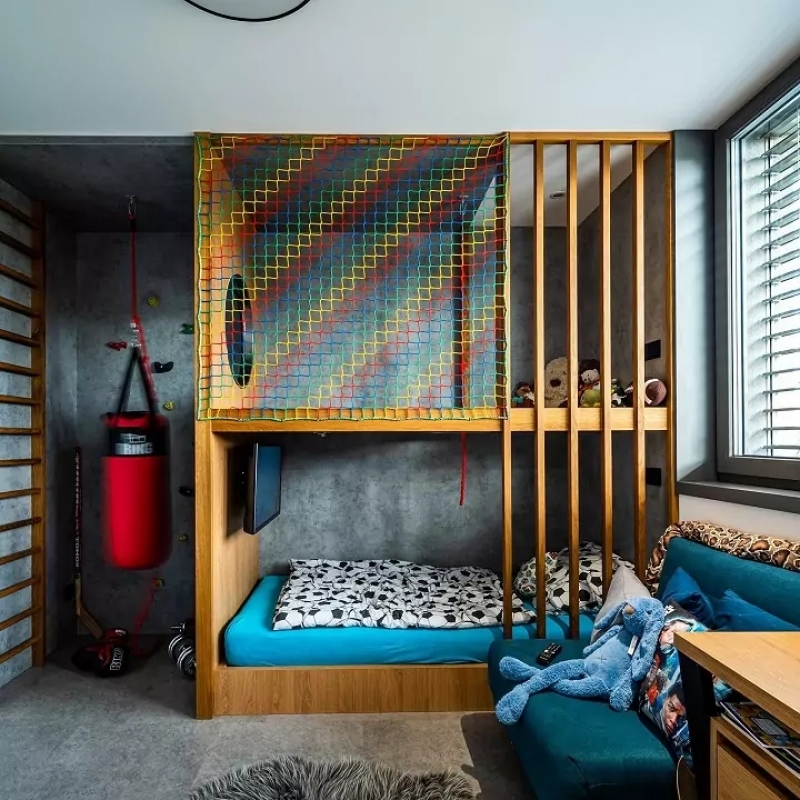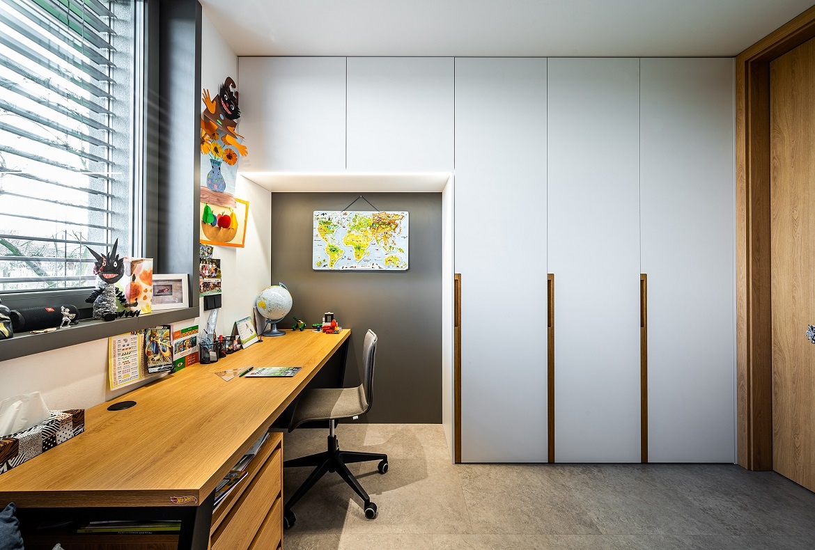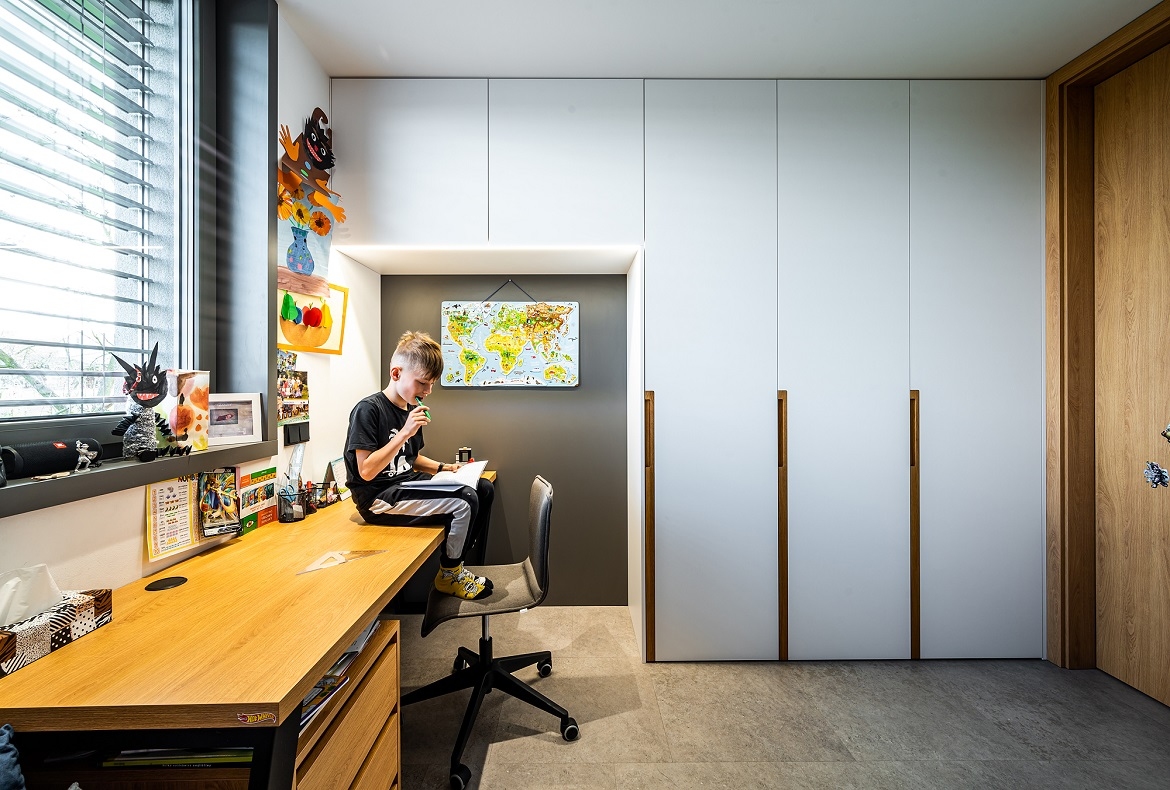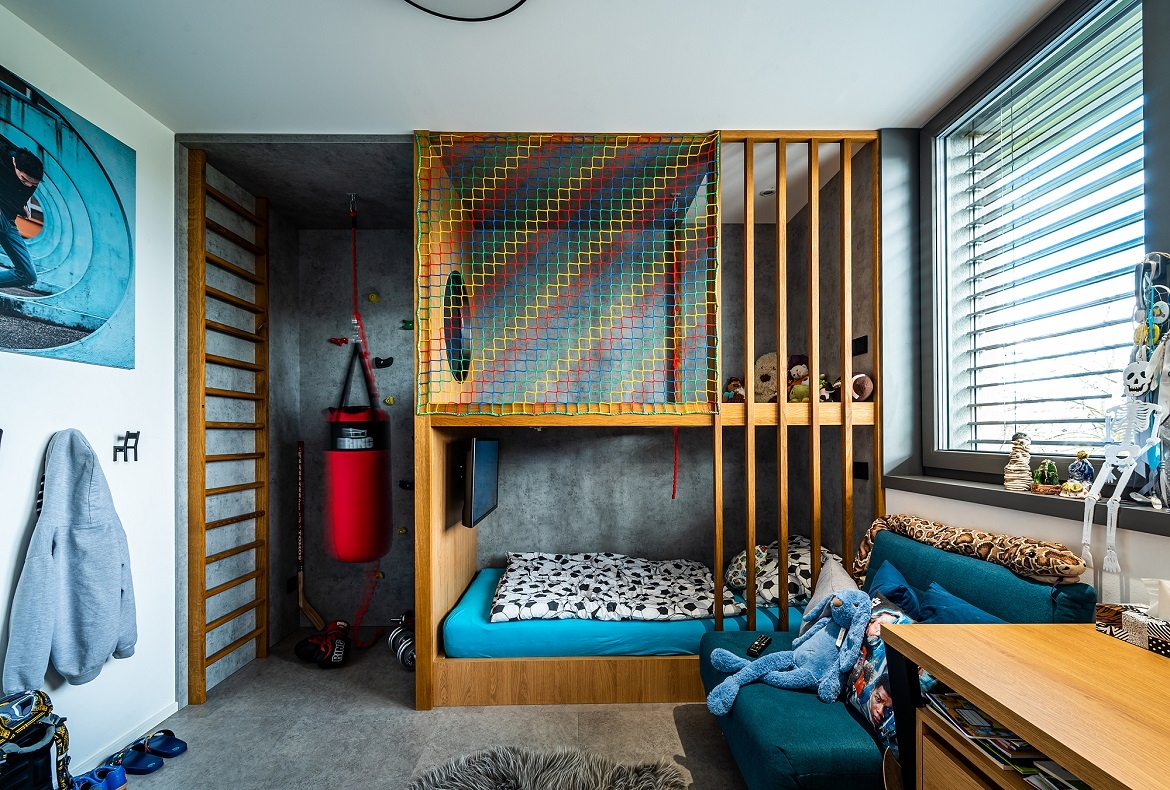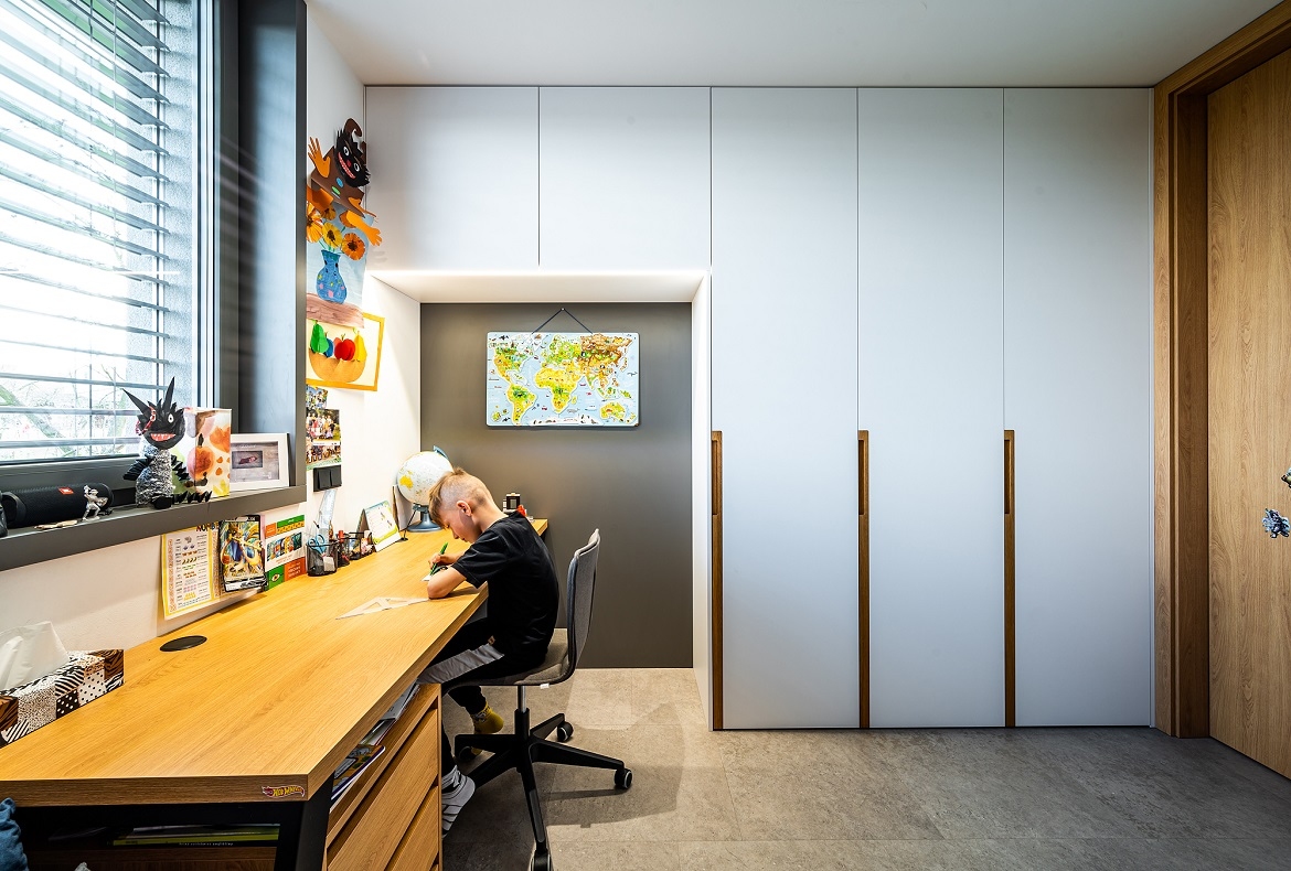 Dětský pokoj hraje nejen nábytkem, ale také zvolenými barvami. V pokoji je také myšleno na zábavu. Výhodou je velký psací stůl a úložný prostor.