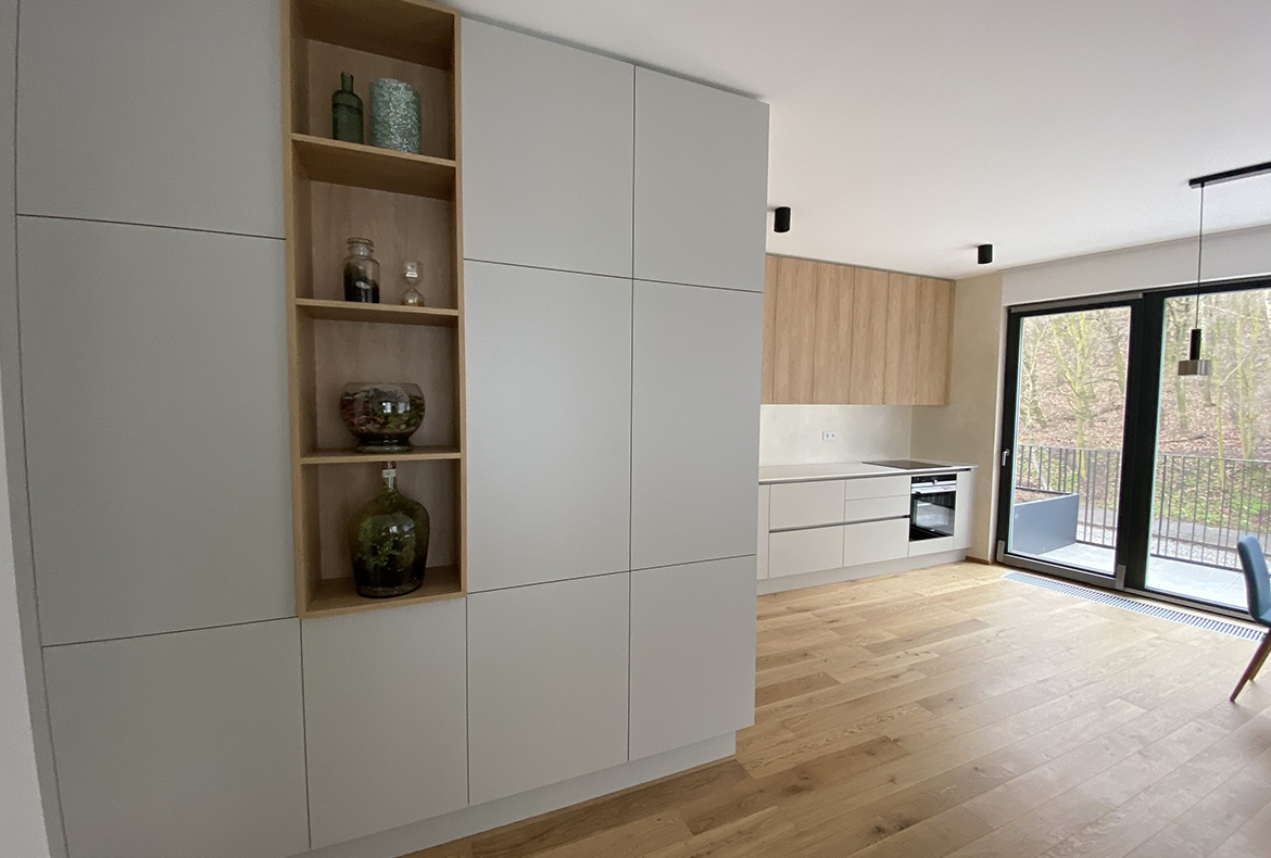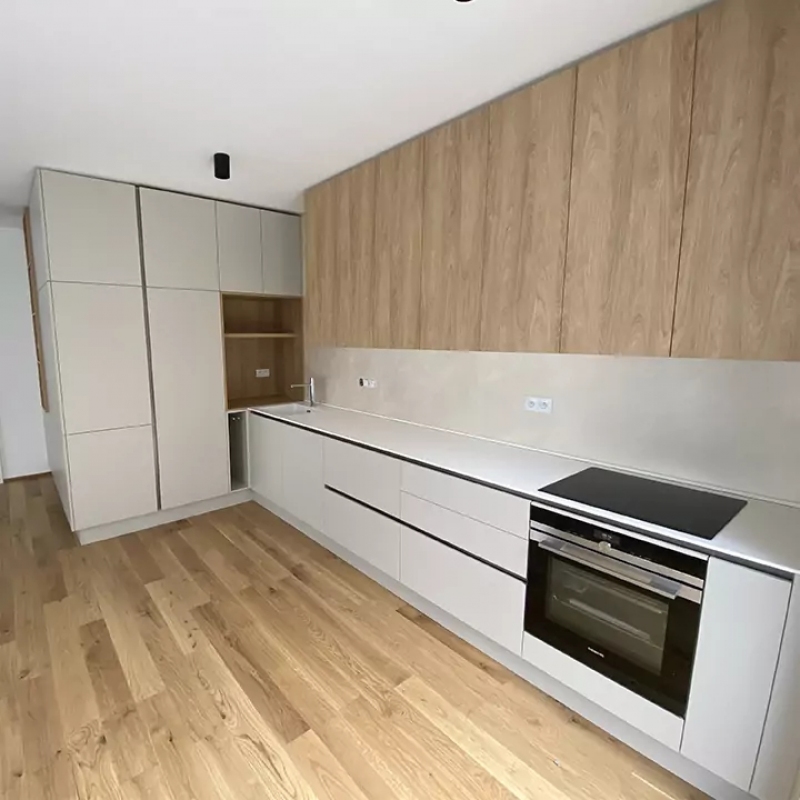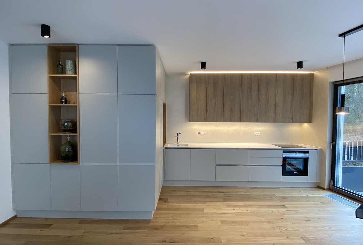 Kuchyně s kompaktní deskou a kávovým koutkem.