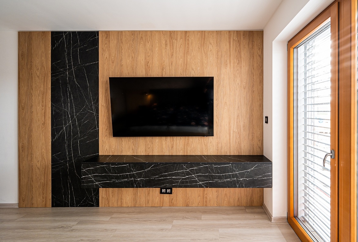 Ložnice s obložením v imitací mramoru a přírodním dubu do kterého jsme zakomponovali TV, komodu a velké zrcadlo.