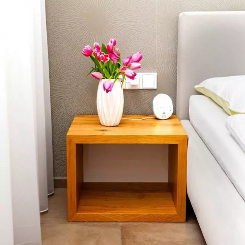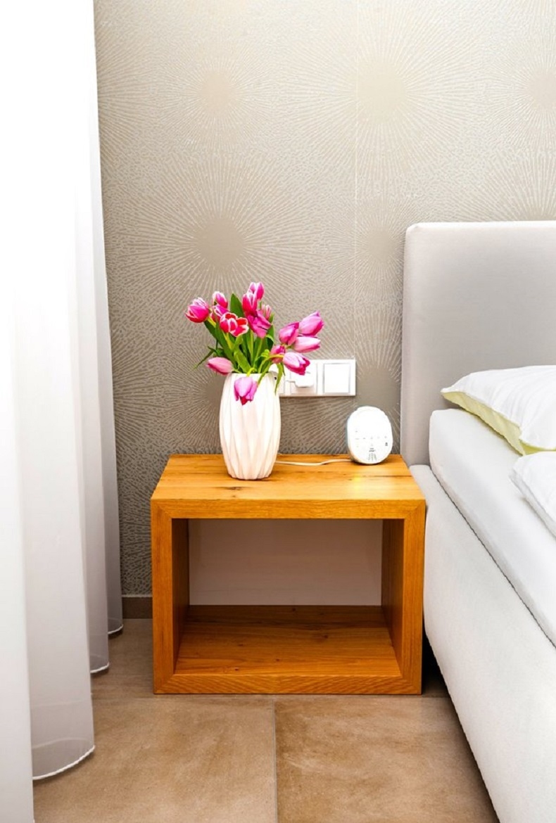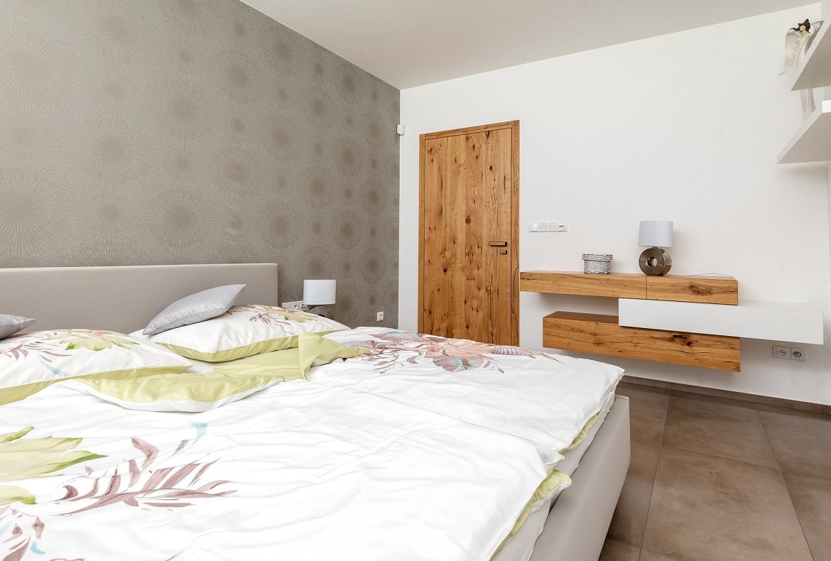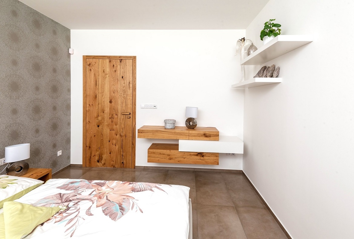 Ložnice ve světlých barvách doplněna dřevem a netradiční závěsnou komodou.