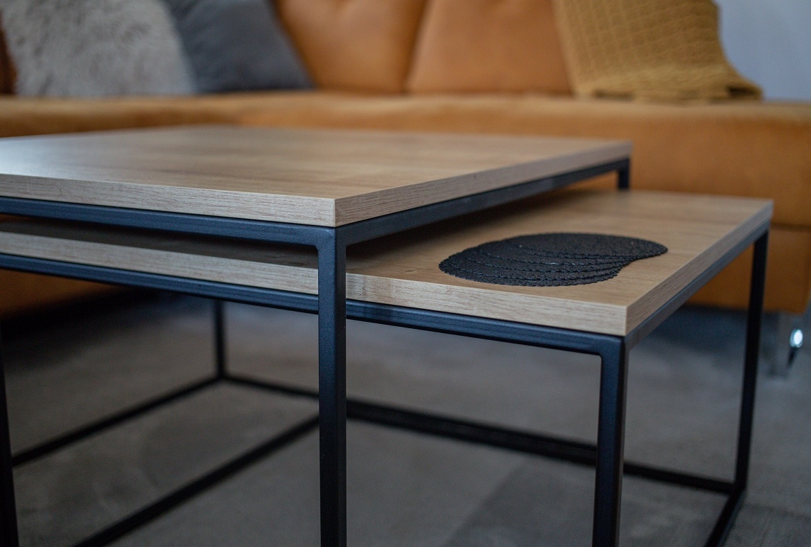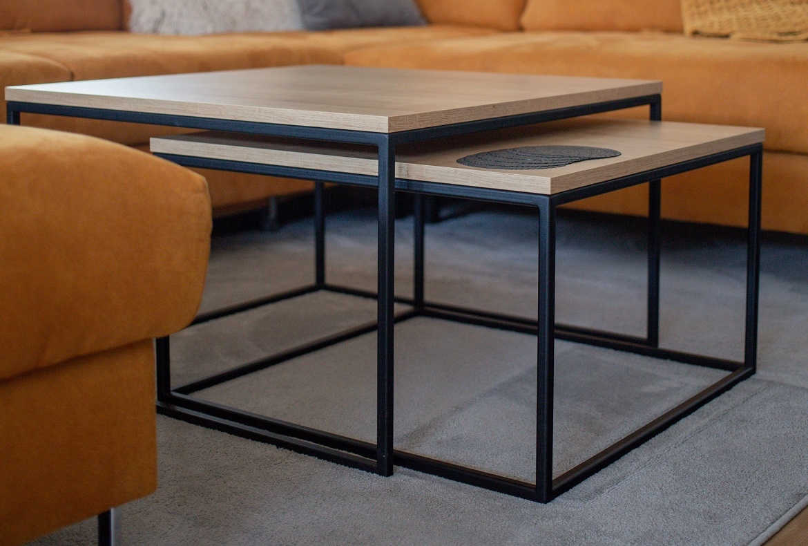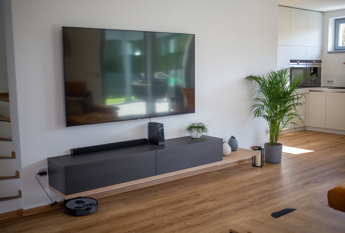 Jednoduchý obývací pokoj se skříňkou pod TV a našimi konferenčními stolíky.