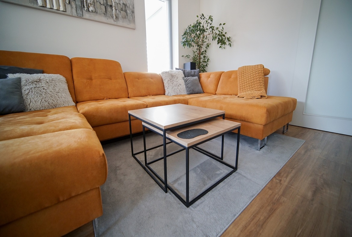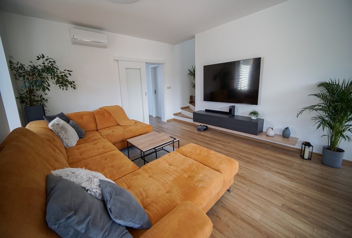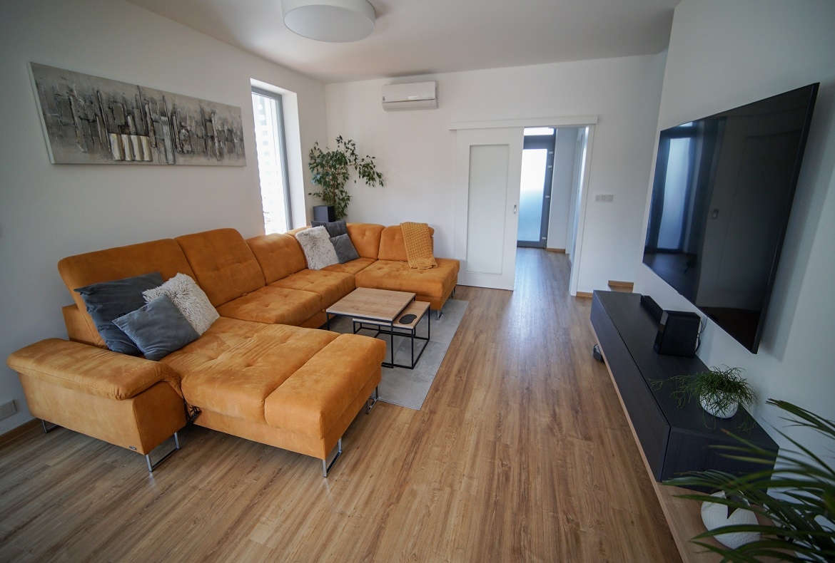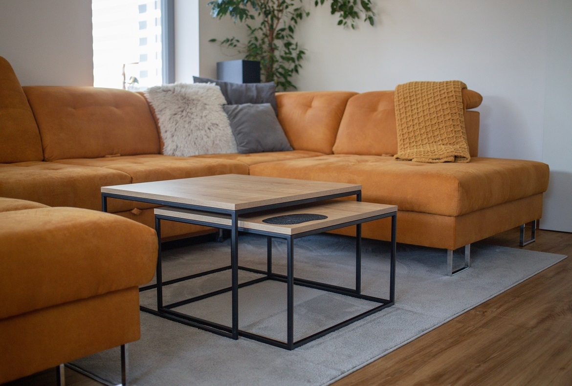 Jednoduchý obývací pokoj se skříňkou pod TV a našimi konferenčními stolíky.