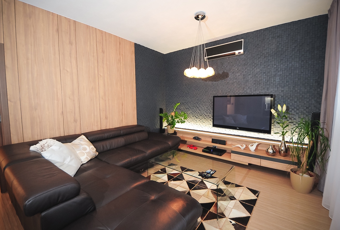 Obývací pokoj s kamenným obkladem