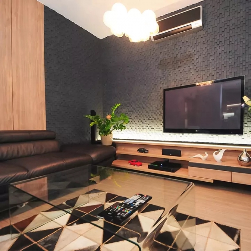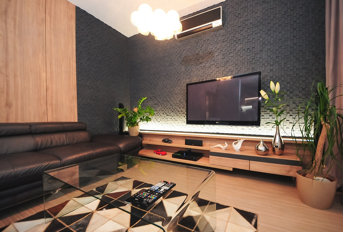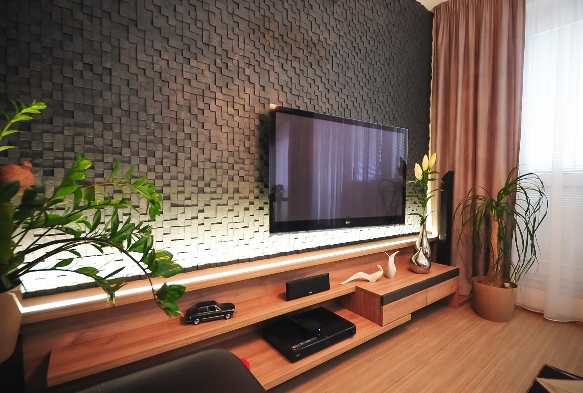 Obývací pokoj s lámaným kamenem je doplněný přírodním obkladem a jednoduchou odkládací policovou částí pod TV.