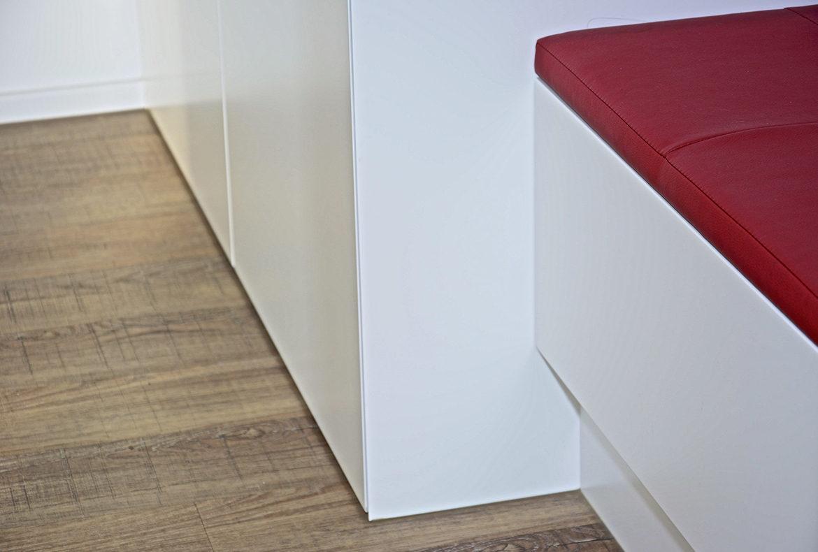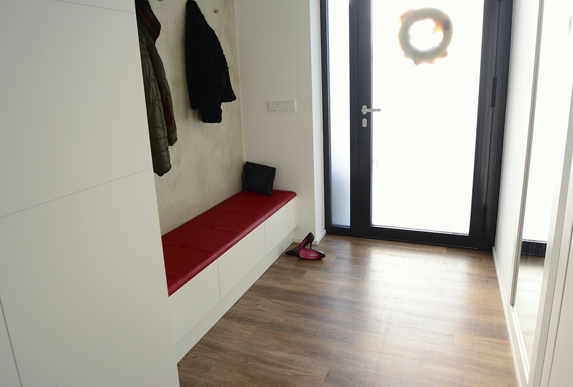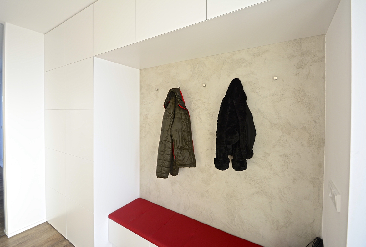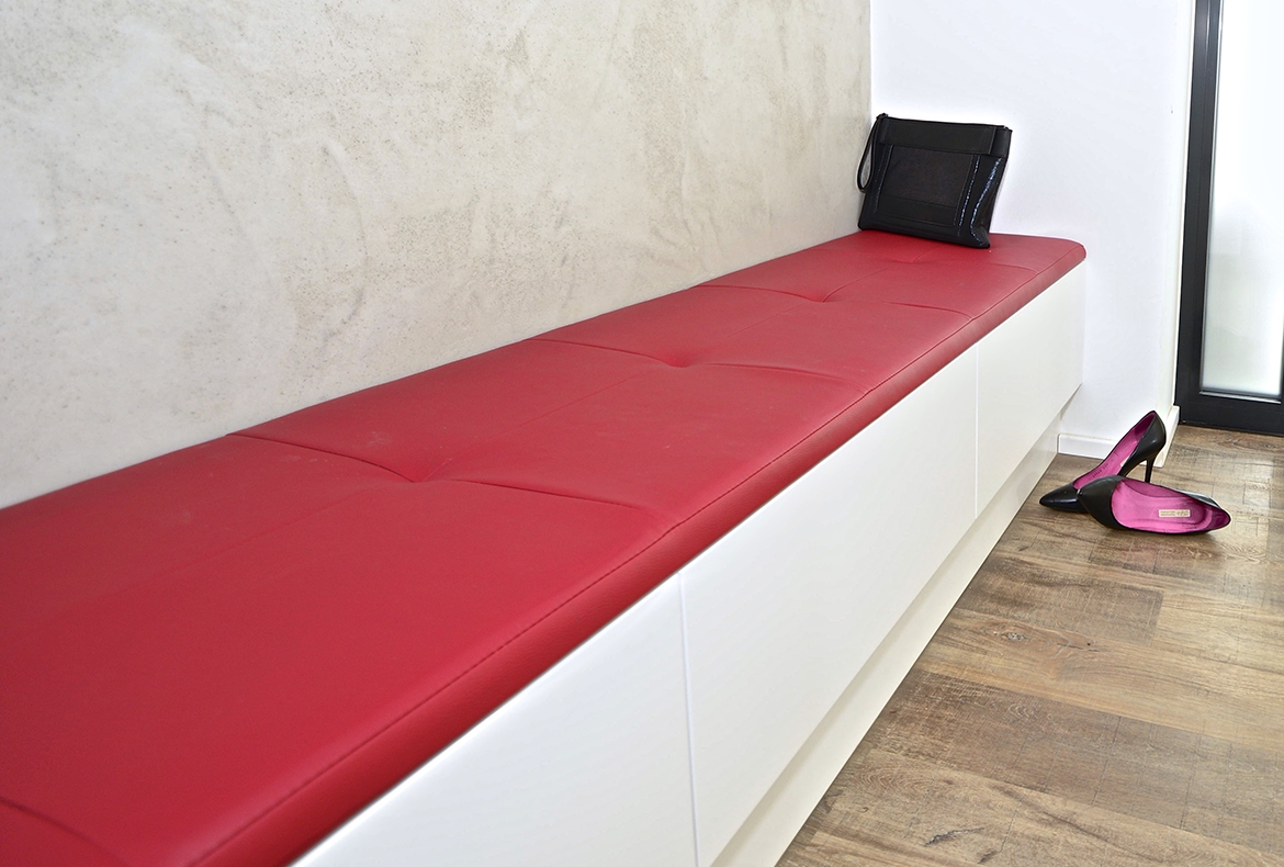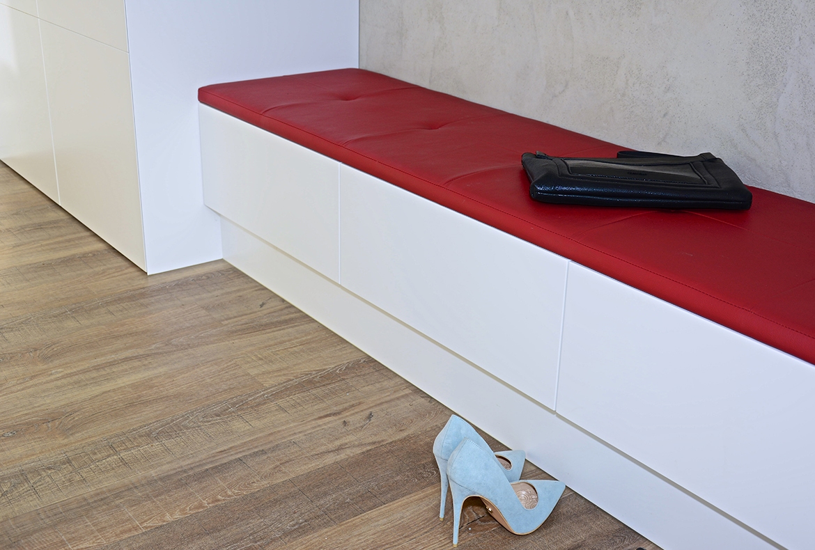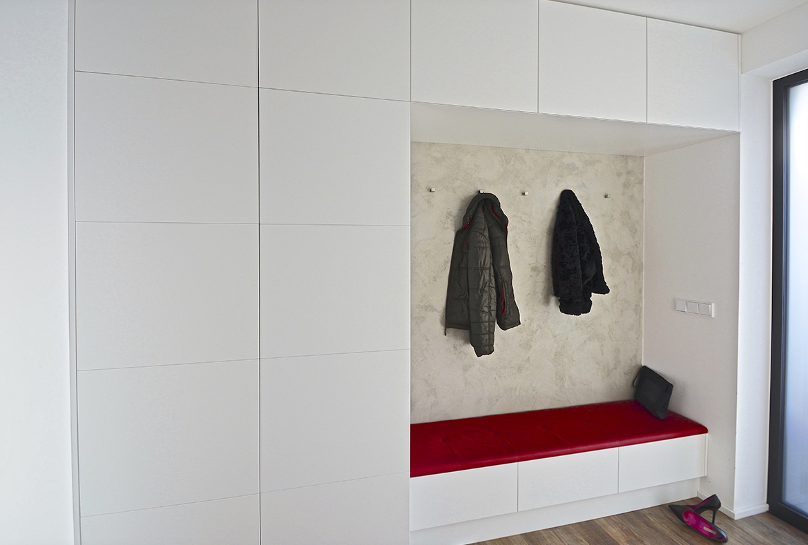 Prostorná bílá předsíň s výrazným čalouněným sedákem a stěrkou.
