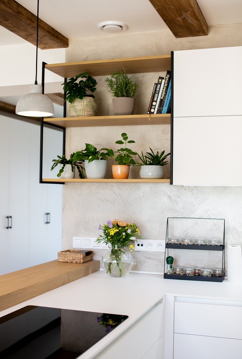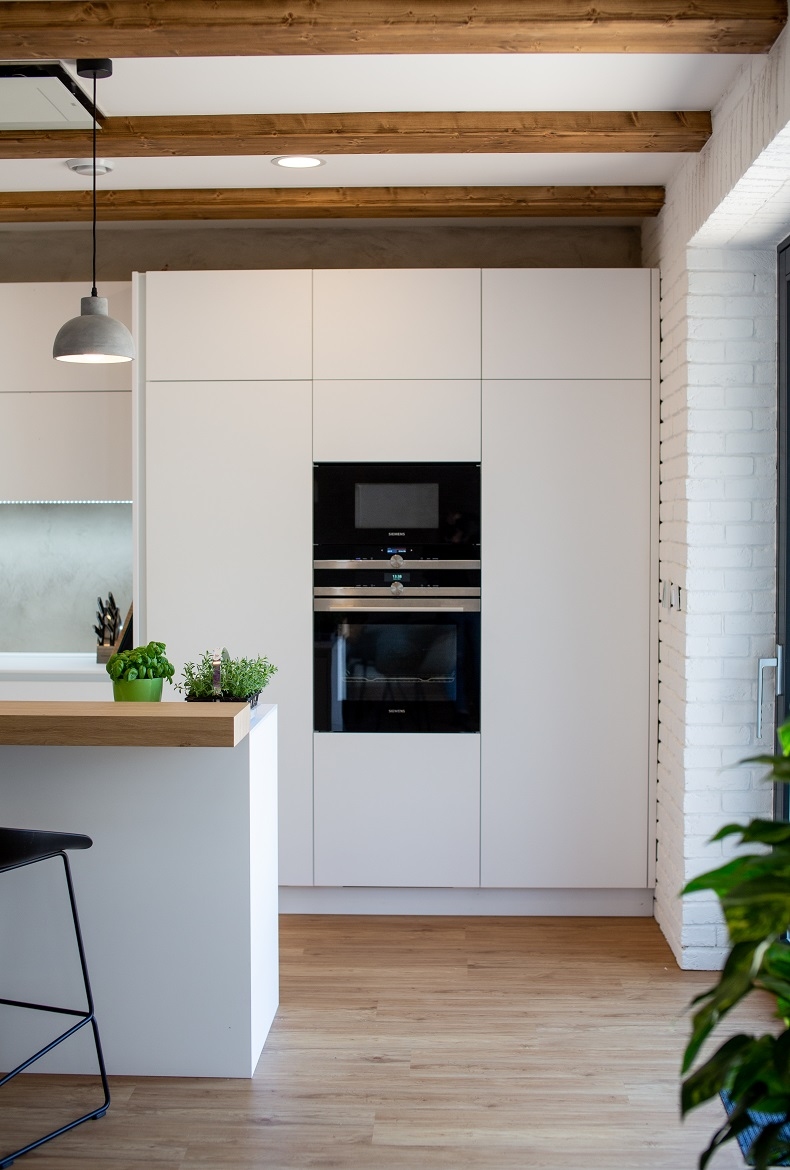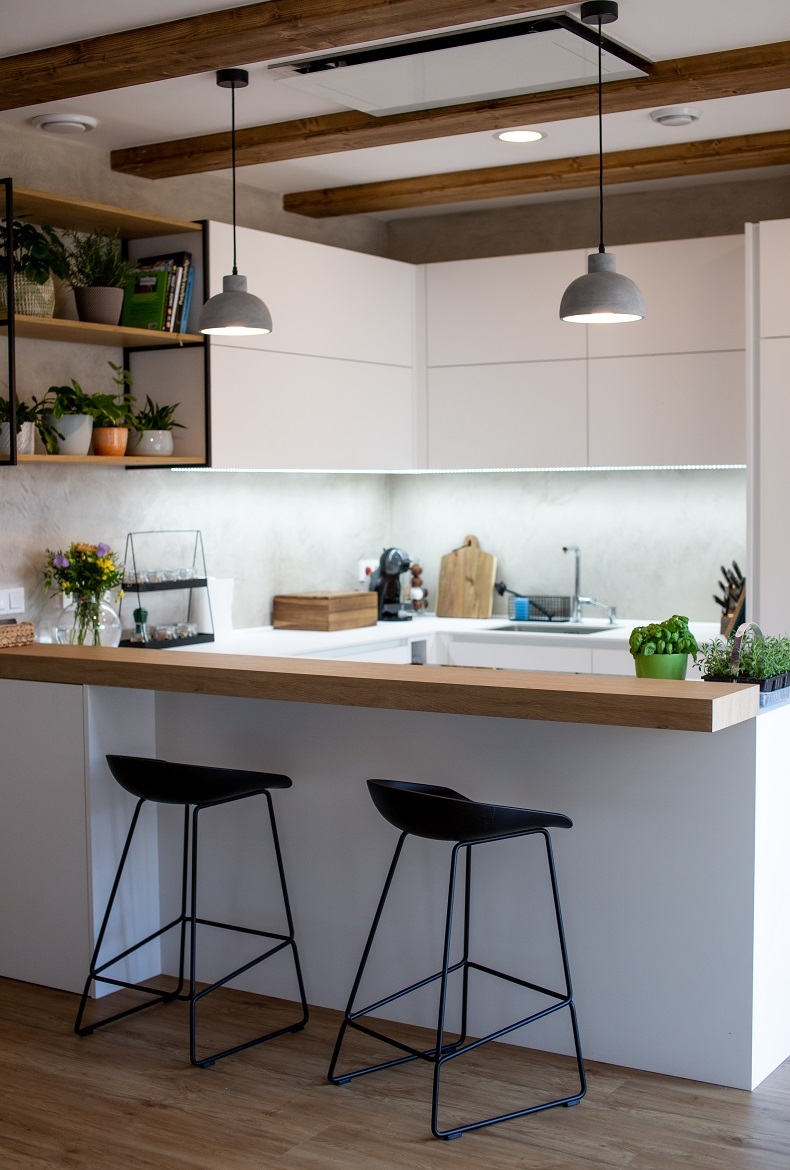 Svěží bílý interiér v minimalistickém stylu, který je doplněn dřevem a trámy.